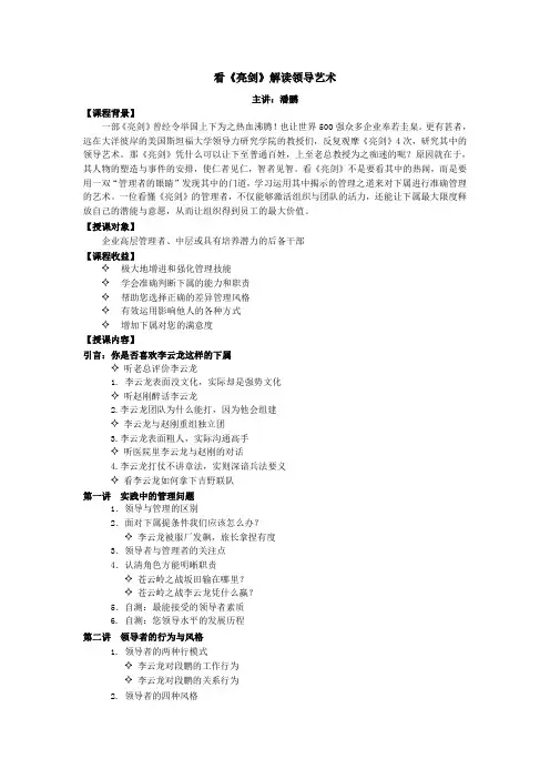 《亮剑》的启示漫谈领导艺术与团队精神引言:从《亮剑》中看李云龙的领导管理艺术和团队精神 (3)第一章领导管理和团队精神的基本概念 (4)第二章领导与团队的关系 (6)第三章领导行为对团队管理的影响 (9)第四章提高团队凝聚力的一些建议 (11)引言:从《亮剑》中看李云龙的领导管理艺术和团队精神《亮剑》让全国人民为之沸腾,《亮剑》到底什么吸引人?军队文化、人文精神是这部片子的主题,也是最让人感兴趣的地方。