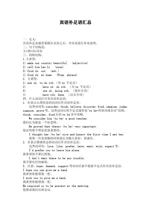 二、句子结构是:主+谓+宾+宾补三、两种结构:1.主表型:1) make our country beautiful (adjective)2) call him Lao Li (noun)3) find sb. out (adv.)4) find sb. at home (Prep. phrase)2. 主谓型:1) ask sb. to do sth.(有to 不定式)2) have sb. do sth. (无to 不定式)3) see sb. doing sth. (现在分词)4) have sth. done. (过去分词)四、什么动词后可有宾语补足语:1. 在表示心理状态的动词后作宾语补足语。