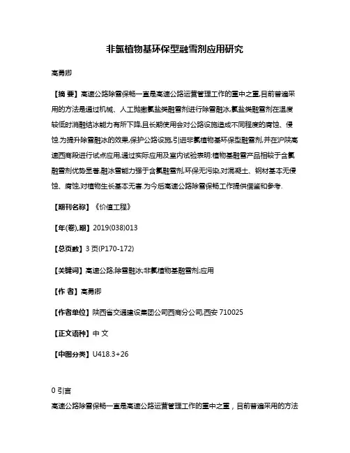 非氯植物基环保型融雪剂应用研究高勇卿【摘要】高速公路除雪保畅一直是高速公路运营管理工作的重中之重,目前普遍采用的方法是通过机械、人工抛撒氯盐类融雪剂进行除雪融冰,氯盐类融雪剂在温度较低时消融结冰能力有所下降,且长期使用会对公路设施造成不同程度的腐蚀、侵蚀.为提升除雪融冰的效果,保护公路设施,引进非氯植物基环保型融雪剂,并在沪陕高速西商段进行试点应用,通过实际应用及室内试验表明:植物基融雪产品相较于含氯融雪剂优势显著,融冰雪能力强于含氯融雪剂,环保无污染,对混凝土、钢材基本无侵蚀、腐蚀,对植物生长基本无害.为今后高速公路除雪保畅工作提供借鉴和参考.【期刊名称】《价值工程》【年(卷),期】2019(038)013【总页数】3页(P170-172)【关键词】高速公路;除雪融冰;非氯植物基融雪剂;应用【作者】高勇卿【作者单位】陕西省交通建设集团公司西商分公司,西安710025【正文语种】中文【中图分类】U418.3+260 引言高速公路除雪保畅一直是高速公路运营管理工作的重中之重,目前普遍采用的方法是通过机械、人工抛撒氯盐类融雪剂进行除雪融冰,氯盐类融雪剂在温度较低时消融结冰能力有所下降,且长期使用会对公路设施造成不同程度的腐蚀、侵蚀。