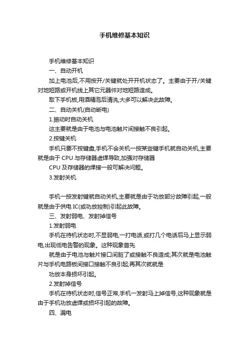 资料范本本资料为word版本,可以直接编辑和打印,感谢您的下载手机维修的基本知识地点:__________________时间:__________________说明:本资料适用于约定双方经过谈判,协商而共同承认,共同遵守的责任与义务,仅供参考,文档可直接下载或修改,不需要的部分可直接删除,使用时请详细阅读内容手机维修基本知识一、自动开机加上电池后,不用按开/关键就处开开机状态了。