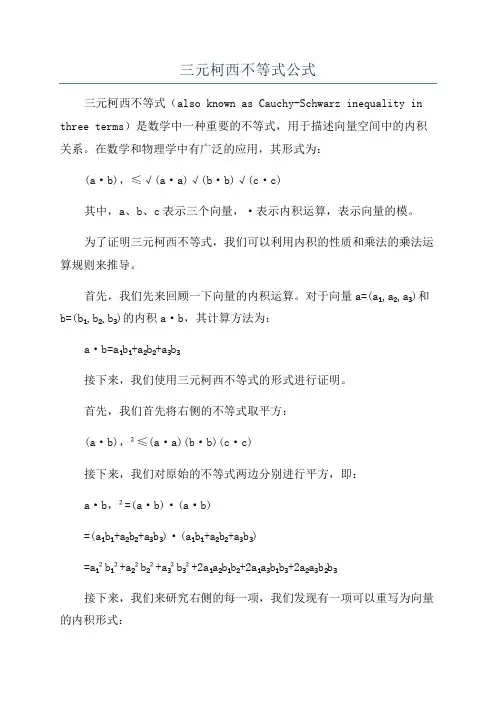 对于向量a=(a₁,a₂,a₃)和b=(b₁,b₂,b₃)的内积a·b,其计算方法为:a·b=a₁b₁+a₂b₂+a₃b₃接下来,我们使用三元柯西不等式的形式进行证明。