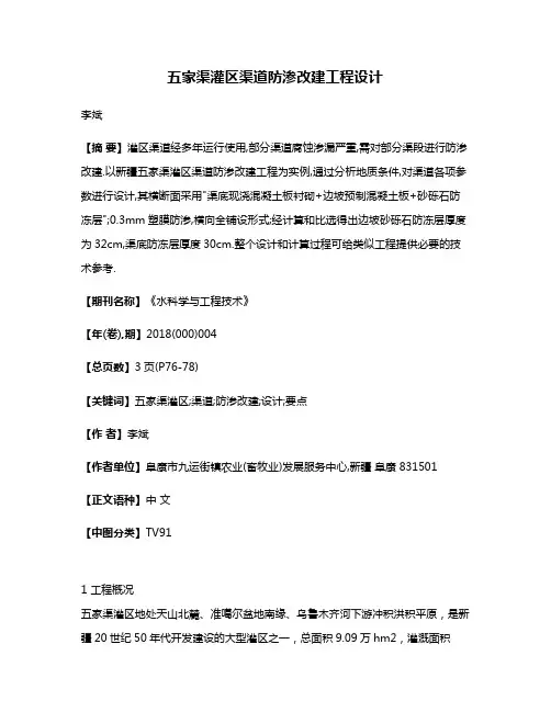 五家渠灌区渠道防渗改建工程设计李斌【摘要】灌区渠道经多年运行使用,部分渠道腐蚀渗漏严重,需对部分渠段进行防渗改建.以新疆五家渠灌区渠道防渗改建工程为实例,通过分析地质条件,对渠道各项参数进行设计,其横断面采用"渠底现浇混凝土板衬砌+边坡预制混凝土板+砂砾石防冻层";0.3mm塑膜防渗,横向全铺设形式;经计算和比选得出边坡砂砾石防冻层厚度为32cm,渠底防冻层厚度30cm.整个设计和计算过程可给类似工程提供必要的技术参考.【期刊名称】《水科学与工程技术》【年(卷),期】2018(000)004【总页数】3页(P76-78)【关键词】五家渠灌区;渠道;防渗改建;设计;要点【作者】李斌【作者单位】阜康市九运街镇农业(畜牧业)发展服务中心,新疆阜康 831501【正文语种】中文【中图分类】TV911 工程概况五家渠灌区地处天山北麓、准噶尔盆地南缘、乌鲁木齐河下游冲积洪积平原,是新疆20世纪50年代开发建设的大型灌区之一,总面积9.09万hm2,灌溉面积2.16万hm2,灌区总人口10.76万人。