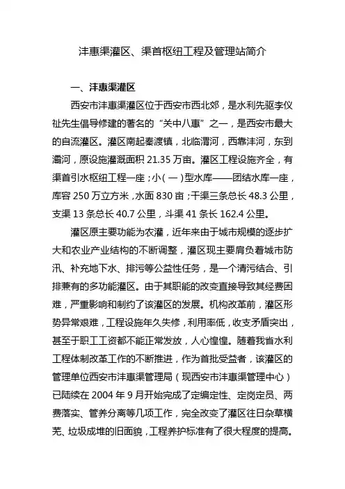 沣惠渠灌区、渠首枢纽工程及管理站简介一、沣惠渠灌区西安市沣惠渠灌区位于西安市西北郊,是水利先驱李仪祉先生倡导修建的著名的“关中八惠”之一,是西安市最大的自流灌区。