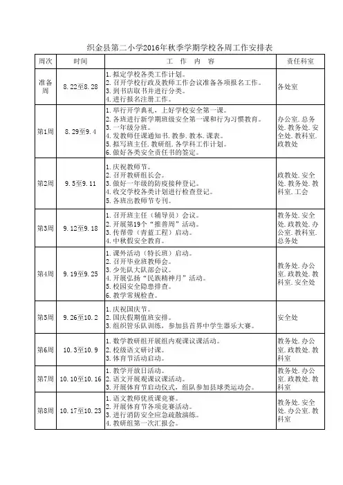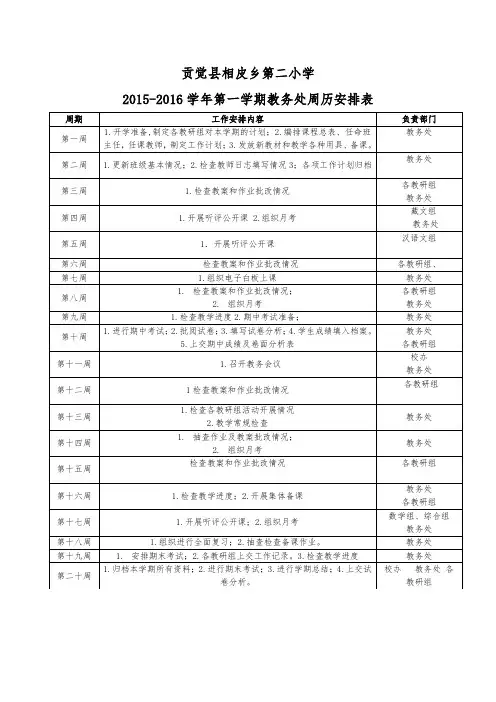 贡觉县相皮乡第二小学2015-2016学年第一学期教务处周历安排表周期工作安排内容负责部门第一周1.开学准备,制定各教研组对本学期的计划;2.编排课程总表、任命班主任,任课教师,制定工作计划;3.发放新教材和教学各种用具、备课。