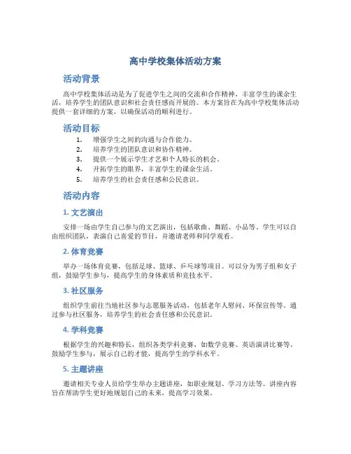 高中班级活动设计方案一、活动目的和意义高中班级活动是丰富学生课余生活的重要组成部分,有助于加强班级凝聚力和团队合作意识,提高学生的社交能力和创新思维能力。
