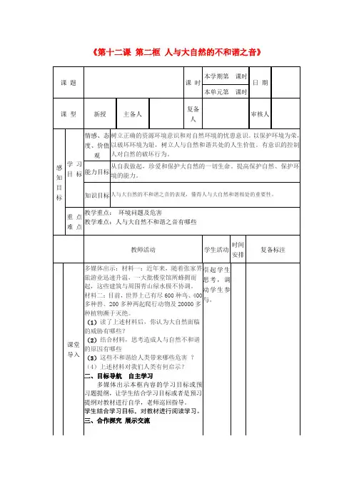 《人与大自然的不和谐之音》教学设计教学内容:鲁教版思想品德八年级(下册)第六单元第十二课第二节课程分析本课时重点研究了人与自然之间出现的种种不和谐之音:自然物种在减少、自然景观遭到人为破坏等等。