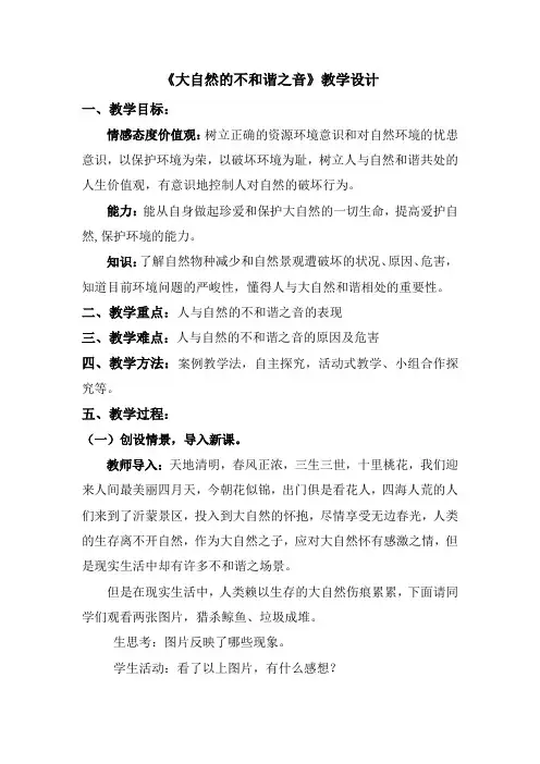 《大自然的不和谐之音》教学设计一、教学目标:情感态度价值观:树立正确的资源环境意识和对自然环境的忧患意识,以保护环境为荣,以破坏环境为耻,树立人与自然和谐共处的人生价值观,有意识地控制人对自然的破坏行为。