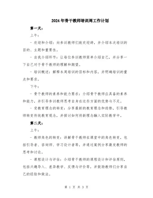 2024年骨干教师培训工作计划范例一、培训目标:1. 提升骨干教师的教学水平和教育教学能力;2. 培养骨干教师的创新思维和研究能力;3. 建立骨干教师的团队协作意识和沟通能力;4. 加强骨干教师的职业素养和师德修养。