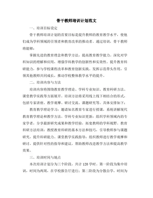 四、培训计划1. 教师专业素养提升1.1 介绍当前教育政策法规及教育理论1.2 分析优秀教师的教学方法与经验1.3 资深教师分享教学管理与教师职业发展经验1.4 学习素质教育与当前教学改革1.5 学习课程设计与评价2. 教学能力提升2.1 学习教学资源开发与利用2.2 掌握教学技术与多媒体教学2.3 加强学科知识与教学能力提升3. 教育心理学与学生心理健康3.1 进行心理学与学生心理健康的学习与实践五、培训考核1. 培训期间,骨干教师需完成培训课程学习,并结合实际教学进行案例分析及教学实践总结。