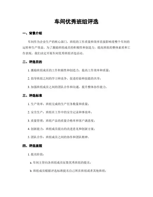 四、评选流程1. 提名阶段:a. 车间主管向各班组成员征集优秀班组的提名;b. 班组成员根据评选标准提名自己所在班组或者其他班组;c. 提名截止后,车间主管对提名进行初步筛选,确定入围班组。