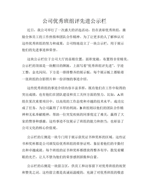 公司优秀班组评先进公示栏近日,我公司举行了一次盛大的评选活动,旨在表彰优秀班组,激励全体员工的工作热情和团队合作精神。