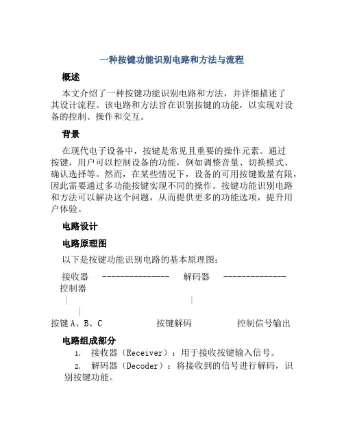 电路设计电路原理图以下是按键功能识别电路的基本原理图:接收器 --------------- 解码器 -------------- 控制器| | |按键A、B、C 按键解码控制信号输出电路组成部分1.接收器(Receiver):用于接收按键输入信号。