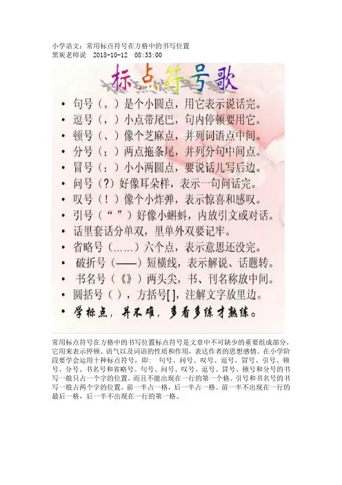 常用标点符号在方格中的书写位置标点符号是文章中不可缺少的重要组成部分,它用来表示停顿、语气以及词语的性质和作用,表达作者的思想感情。