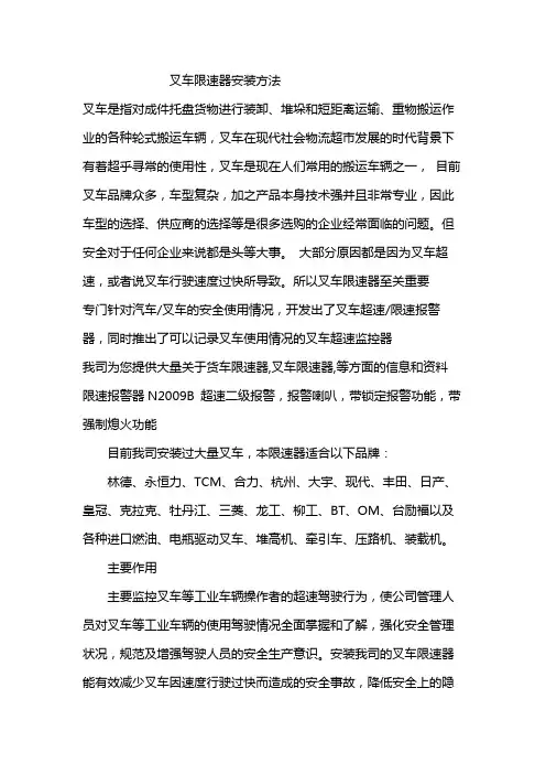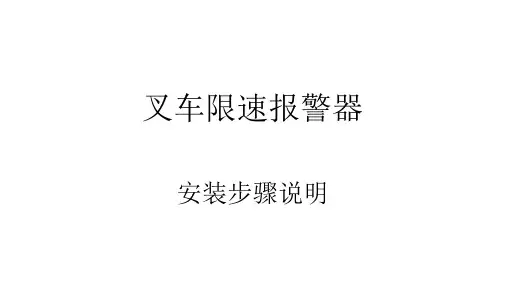 叉车限速报警器说明书目 录一、产品简介1.1 概述1.2 报警器组成部件和主要性能参数1.3 报警器基本功能二、面板及按键说明2.1 面板图2.3 按键使用说明三、参数说明3.1 开机3.2 限速值3.5 车轮直径3.8 密码四、安装步骤4.1 安装前准备4.2 测速传感器安装4.3 报警灯安装4.4 控制器安装4.5 连接控制线五、常见故障及解决方法一、产品简介1.1 概述该叉车限速报警器可应用与各种叉车,也可用于各种工程车(如堆高车、站内搬运车、汽车等)的限速报警。