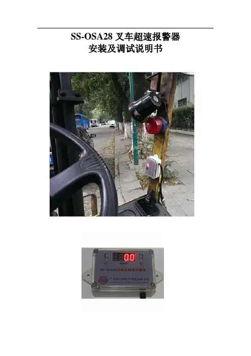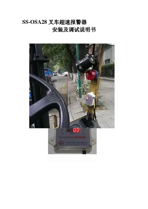 SS-OSA28叉车超速报警器安装及调试说明书首先非常感谢您选择SS-OSA28叉车超速报警器!随着我国市场经济的深入和人民生活水平的不断提高,安全将越来越为现代人所重视,安全法律法规也不断出台,相关安全的产品也不断涌现,厂内机动车的安全问题同样不容忽视,SS-OSA28叉车超速报警器正是为此而开发的微电脑智能电子产品。