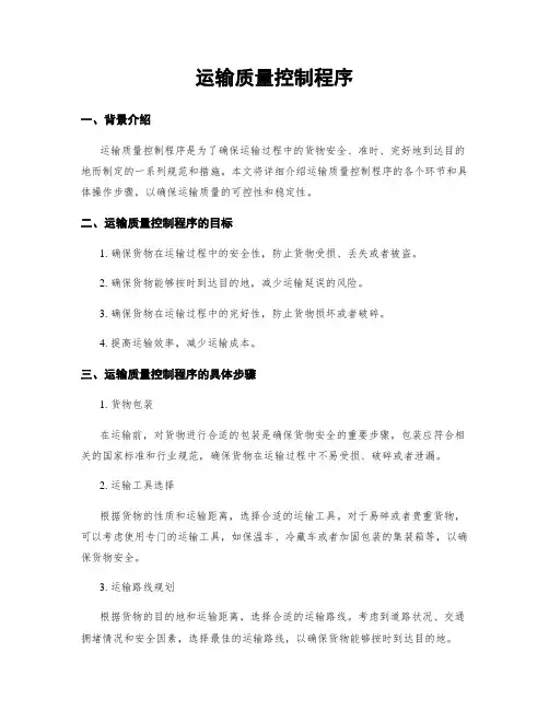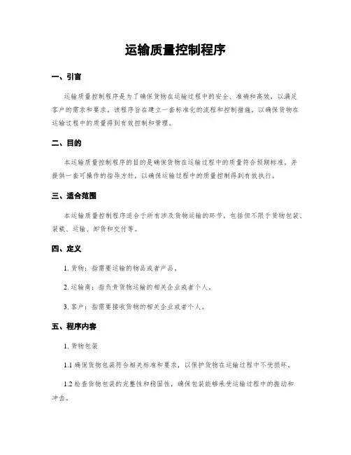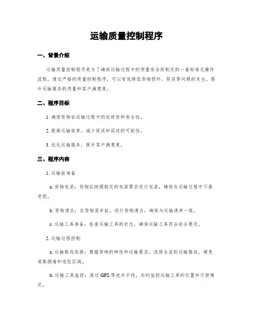 二、运输质量控制程序的目标1. 确保货物在运输过程中的安全性,避免货物受损、丢失或者被盗的情况发生。