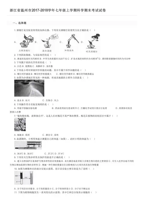 浙江省温州市2017-2018学年七年级上学期科学期末考试试卷一、选择题1. 酒精灯是实验室常用的加热仪器,下列有关酒精灯的使用方法正确的是( )A .B .C .D .2. 下列四组数据,与实际相符的是( )A . 课桌的高度约为75厘米B . 中学生的质量约为20千克C . 矿泉水瓶的体积约为10厘米D . 课间眼保健操时间约为15分钟 3. 下列属于纸的化学性质的是( )A . 白色B . 能燃烧C . 易撕碎D . 易折叠4. 下列是小明对班级同学所提的问题,其中不属于科学问题的是()A . 哪位同学最高 B . 哪位同学质量最大 C . 哪位同学最帅 D . 哪位同学跳得最远5. 如图为沙漠地区常见的一种地貌,形成该地貌的主要外力因素是( )A . 流水B . 冰川C . 生物D . 风力6. 下列操作符合实验室规则的是( )A . 用湿手接触实验电源B .药品使用前先看说明书 C . 打翻化学试剂只需自行处理 D . 将固体垃圾直接倒入水槽7. “墙角数枝梅,凌寒独自开”,这是人们对梅花不畏严寒的赞赏。
