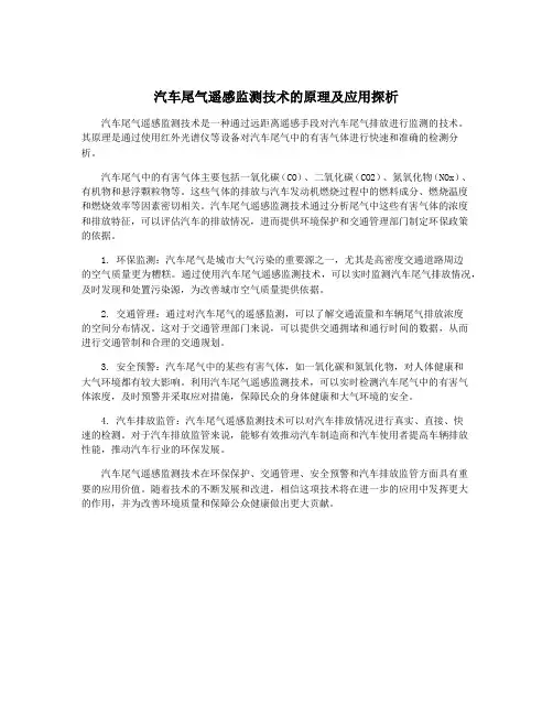 汽车尾气遥感监测技术的原理及应用探析汽车尾气遥感监测技术是一种通过遥感技术对汽车尾气进行监测和分析的技术。
