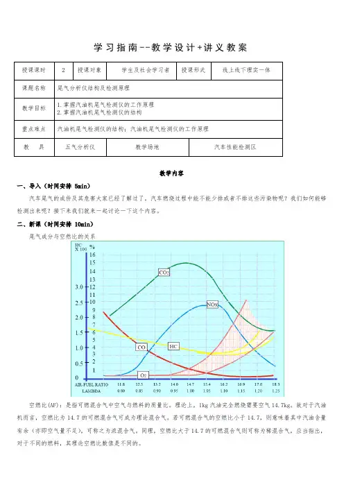 学习指南--教学设计+讲义教案授课课时 2 授课对象学生及社会学习者授课形式线上线下理实一体课题名称尾气分析仪结构及检测原理教学目标1.掌握汽油机尾气检测仪的工作原理2.掌握汽油机尾气检测仪的结构重点难点汽油机尾气检测仪的结构;汽油机尾气检测仪的工作原理教具五气分析仪教学场地汽车性能检测区教学内容一、导入(时间安排 5min)汽车尾气的成份及其危害大家已经了解过了,汽车燃烧过程中能不能少排或者不排这些污染物呢?我们如何能够检测出来呢?接下来我们就来一起讨论一下这个内容。