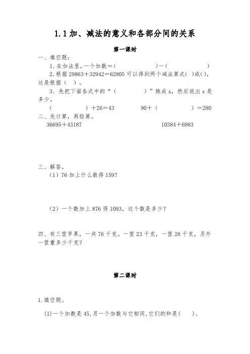 1.1加、减法的意义和各部分间的关系第一课时一、填空题:1.在加法里,一个加数=()-()2.根据29863+32942=62805可以得到两个减法算式()或(),这是根据()。