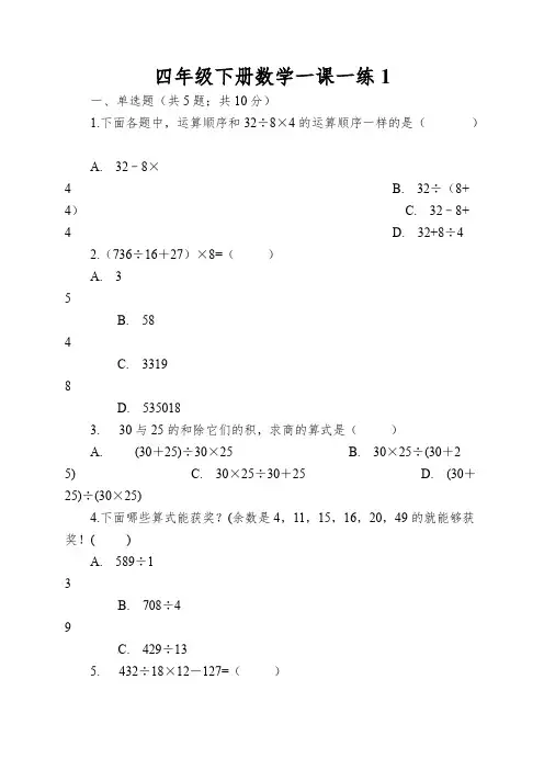 四年级下册数学一课一练1一、单选题(共5题;共10分)1.下面各题中,运算顺序和32÷8×4的运算顺序一样的是()A.32﹣8×4 B.32÷(8+ 4) C.32﹣8+4 D.32+8÷42.(736÷16+27)×8=()A.35B.584C.33198D.5350183.30与25的和除它们的积,求商的算式是()A.(30+25)÷30×25B.30×25÷(30+25) C.30×25÷30+25 D.(30+25)÷(30×25)4.下面哪些算式能获奖?(余数是4,11,15,16,20,49的就能够获奖!()A.589÷13B.708÷49C.429÷135.432÷18×12-127=()A.111B.161C.285D.6486二、判定题(共5题;共10分)6.判定正误.125×8÷25×4=1000÷100=107.判定对错(203÷7+21)÷5=308.25×4÷25×4=100÷100=1.(判定对错)9.判定对错760减去490的差,再乘30,积是810.10.6×4÷6×4=1.(判定对错)三、填空题(共10题;共26分)11.(1)(349+451)÷80=________(2)46×(270-135)=________12.口算:(1)7000÷100=________(2)90×70=________(3)8×70×5=________(4)560÷70×8=________(5)53+47×2=________(6)66÷11=________13.230÷[(190+270)÷10]=________14.“486-320÷16×15”的运算顺序是:先算________法,再算_ _______法,最后算________法.15.运算39+18×(30-16)=________16.把下面算式合并为一个综合算式.121+45=166166×5=830综合算式:(________+________)×________=________(从左到右依次填写)17.623-(131×3-294)=________(125+47)×(34+17)=________18.运算.216+25×31=________19.运算24×(27-27)÷16,应先算________,再算________,最后算__ ______,运算结果是________。