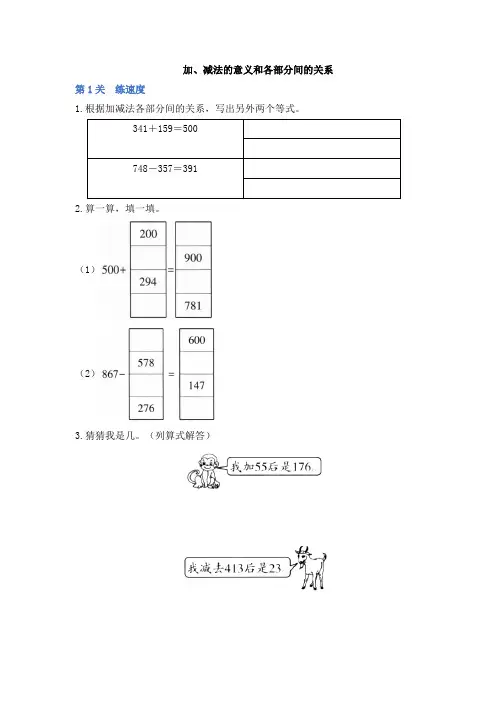 加、减法的意义和各部分间的关系第1关练速度1.根据加减法各部分间的关系,写出另外两个等式。