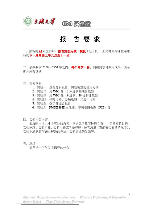 三.实验项目1、实验一组合逻辑设计、实验装置的使用方法2、实验二用VHDL设计十六进制加法计数器3、实验三用VHDL设计6进制、60进制计数器4、实验四报时电路、分频电路、二选一电路5、实验五数字钟综合设计6、实验六 PROTEL99SE原理图、印制电路板图(PCB)设计四.实验报告内容要反映出以上6个实验的内容,重点说明数字钟综合设计,包括实验目的、实验原理、实验步骤、实验电路或者是程序、仿真波形(在能够仿真的情况下)、实验中遇到的问题及解决的方法,实验完成的效果等。