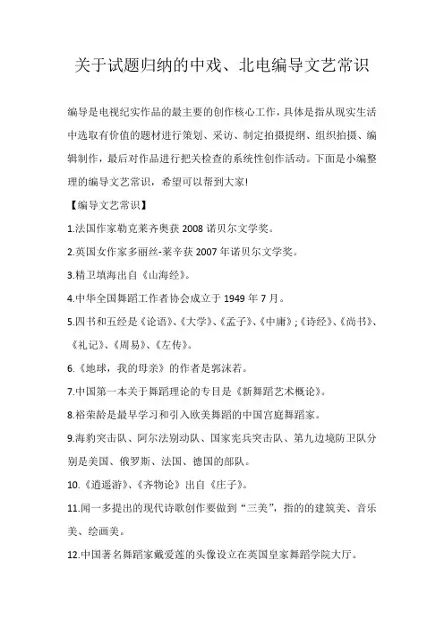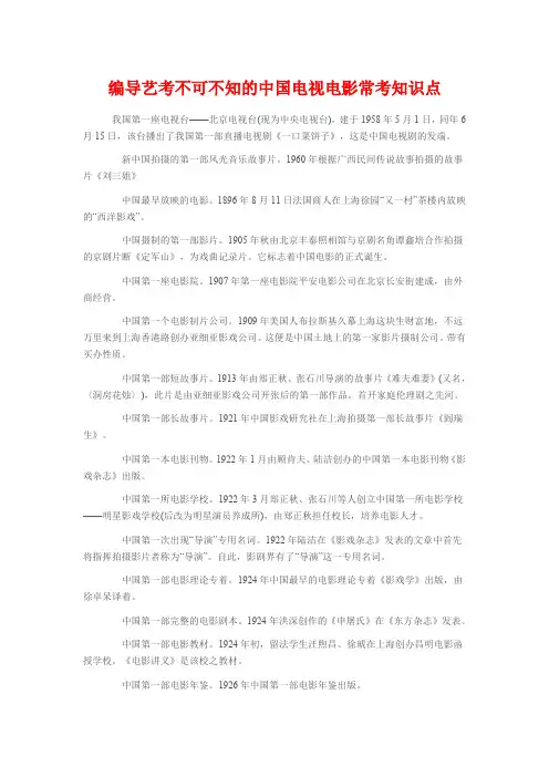 高考艺术编导生统考文常知识点汇总(三)一.电影起源1.外国电影原理:视觉暂留原理时间:1895年12月28日地点:法国巴黎卡普新路大咖啡馆地下室发明人:卢米埃尔兄弟,电影之父代表影片:世界第一部电影《火车进站》,世界第一部喜剧《水浇园丁》定义:第七艺术,1911年,乔托卡努杜2.中国电影时间:1905年代表影片:《定军山》,中国第一部电影,北京丰泰照相馆拍摄,任庆泰导演,老生谭鑫培主演。