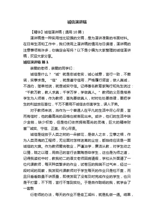 诚信演讲稿【精华】诚信演讲稿(通用10篇)演讲稿是一种实用性比较强的文稿,是为演讲准备的书面材料。