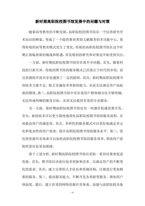 1. 引言1.1 高职院校图书馆的重要性高职院校图书馆是高等学校的重要组成部分,承担着提供信息资源、支持教学科研和培养学生信息素养等重要职责。