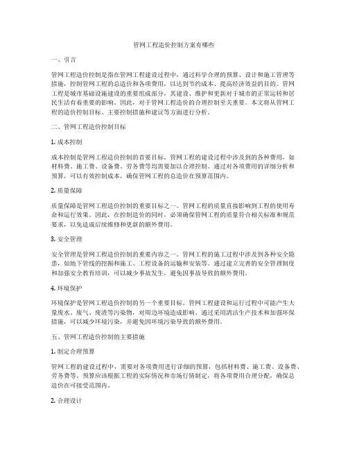 管网工程造价控制方案有哪些一、引言管网工程造价控制是指在管网工程建设过程中,通过科学合理的预算、设计和施工管理等措施,控制管网工程的总造价和各项费用,以达到节约成本、提高经济效益的目的。