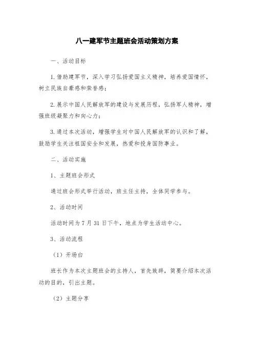 八一建军节主题班会活动策划方案一、活动目标1.借助建军节,深入学习弘扬爱国主义精神,培养爱国情怀,树立民族自豪感和荣誉感;2.展示中国人民解放军的建设与发展历程,弘扬军人精神,增强班级凝聚力和向心力;3.通过本次活动,增强学生对中国人民解放军的认识和了解,鼓励学生关注祖国安全和发展,热爱和投身国防事业。