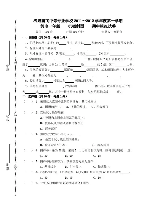泗阳霞飞中等专业学校2011~2012学年度第一学期机电一年级 机械制图 期中模拟试卷分值:100分 时间100分钟 命题人:刘丽莉一、填空题(共30分,每空1分)1、图样上的尺寸是零件的 尺寸,尺寸以 为单位时,不需标注代号或名称。
