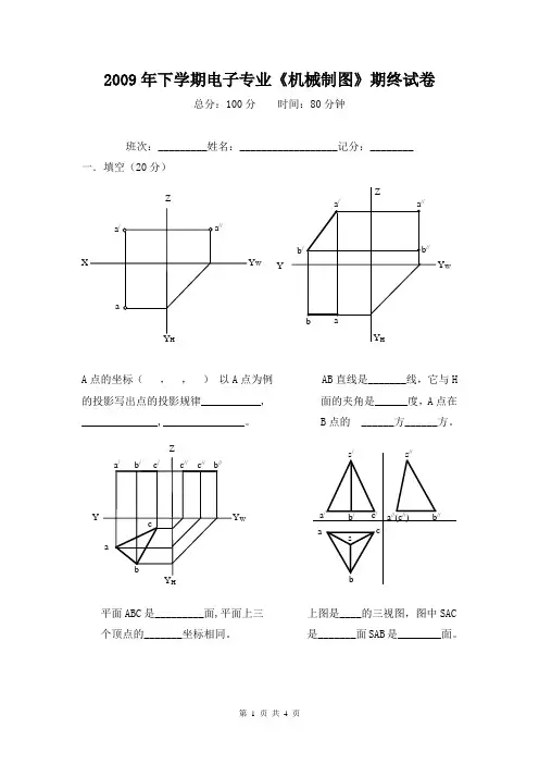 2009年下学期电子专业《机械制图》期终试卷总分:100分 时间:80分钟班次:_________姓名:__________________记分:________一.填空(20分)A 点的坐标( , , ) 以A 点为例 AB 直线是_______线,它与H 的投影写出点的投影规律___________, 面的夹角是______度,A 点在______________,_______________。