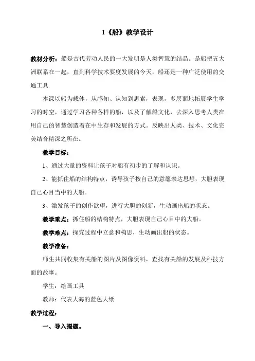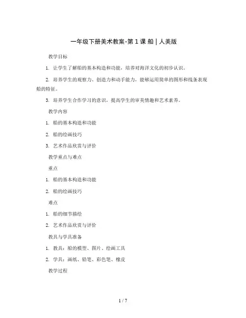 一年级美术下册教案-《1. 船》人美版教学目标本课旨在引导学生通过观察、想象和表现,了解船的基本结构,培养对船的审美情感。