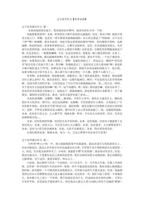 文档下载后可定制修改,请根据实际需要进行调整和使用,谢谢!并且,本店铺为大家提供各种类型的经典范文,如总结报告、合同协议、规章制度、条据文书、策划方案、心得体会、演讲致辞、教学资料、作文大全、其他范文等等,想了解不同范文格式和写法,敬请关注!Download tips: This document is carefully compiled by this editor. I hope that after you download it, it can help you solve practical problems. The document can be customized and modified after downloading, please adjust and use it according to actual needs, thank you!Moreover, our store provides various types of classic sample essays, such as summary reports, contract agreements, rules and regulations, doctrinal documents, planning plans, insights, speeches, teaching materials, complete essays, and other sample essays. If you want to learn about different sample formats and writing methods, please pay attention!辽宁高考满分作文【精选3篇】在学习、工作乃至生活中,说到作文,大家肯定都不陌生吧,作文根据写作时限的不同可以分为限时作文和非限时作文。