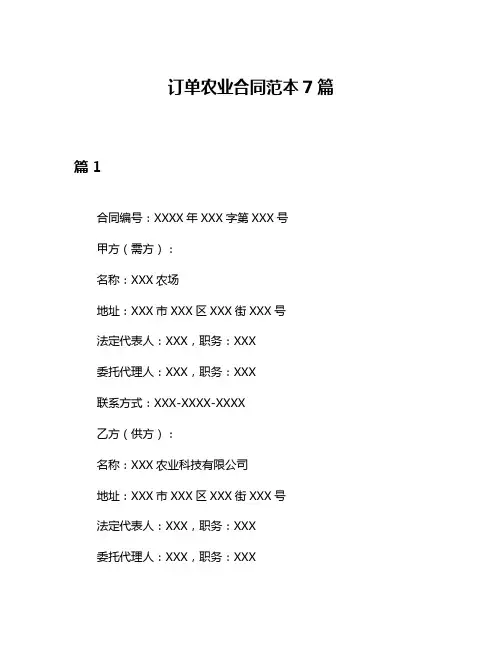 订单农业合同范本7篇篇1合同编号:XXXX年XXX字第XXX号甲方(需方):名称:XXX农场地址:XXX市XXX区XXX街XXX号法定代表人:XXX,职务:XXX委托代理人:XXX,职务:XXX联系方式:XXX-XXXX-XXXX乙方(供方):名称:XXX农业科技有限公司地址:XXX市XXX区XXX街XXX号法定代表人:XXX,职务:XXX委托代理人:XXX,职务:XXX联系方式:XXX-XXXX-XXXX根据《中华人民共和国合同法》等相关法律法规,甲乙双方在平等、自愿、公平、诚实信用的基础上,就甲方通过订单方式向乙方采购农产品事宜,达成如下协议:一、合同标的及内容1. 甲方通过订单方式向乙方采购农产品,具体包括:农产品名称、规格、数量、质量要求、包装方式、交货时间、交货地点等,以双方确认的订单为准。