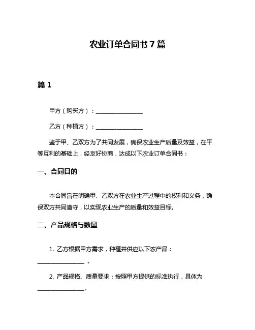 农业订单合同书7篇篇1甲方(购买方):__________________乙方(种植方):__________________鉴于甲、乙双方为了共同发展,确保农业生产质量及效益,在平等互利的基础上,经友好协商,达成以下农业订单合同书:一、合同目的本合同旨在明确甲、乙双方在农业生产过程中的权利和义务,确保双方共同遵守,以实现农业生产的质量和效益目标。