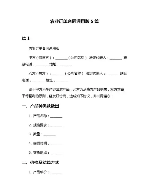 甲方(买方)签字:__________ 日期:__________乙方(卖方)签字:__________ 日期:__________篇2农业订单合同通用版合同编号:___________________甲方(供货方):______________乙方(订购方):______________经过双方友好协商,为了明确双方的权利和义务,根据《合同法》及相关法律法规的规定,达成如下协议:一、供货内容及数量甲方同意向乙方供应以下农产品(品种、规格、数量等详细描述)。