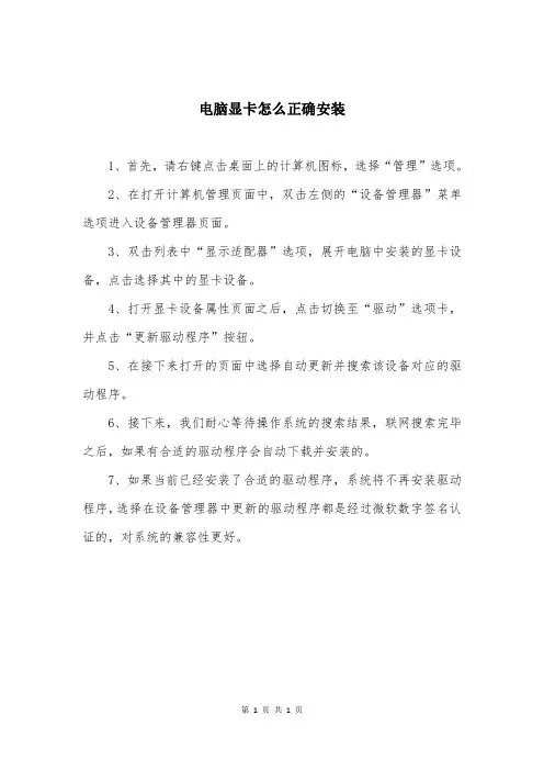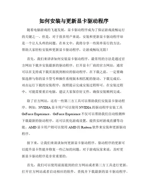 显卡驱动的安装方法1. 引言显卡驱动是电脑硬件中一个非常重要的组成部分,它负责管理并控制显卡的性能和功能。