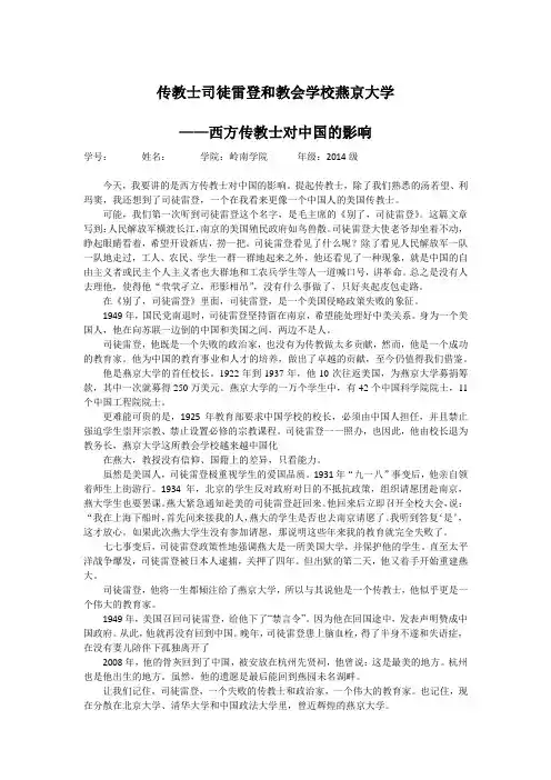 传教士司徒雷登和教会学校燕京大学——西方传教士对中国的影响学号:姓名:学院:岭南学院年级:2014级今天,我要讲的是西方传教士对中国的影响。