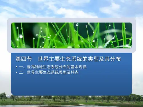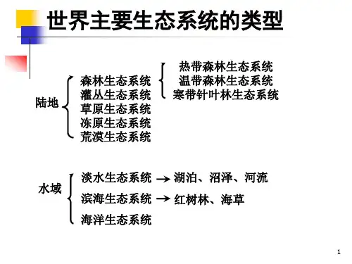 4 地球上主要生态系统类型4.1 陆地生态系统全球陆地面积约占总面积的三分之一,但陆地生物群落的现存生物量却占了全球的99%以上,可见,陆地生物群落在整个生物圈中起着至关重要的作用。