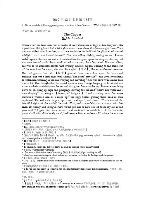 2010年12月5日练习材料1. Please read the following passage and translate it into Chinese. (25%)(中南大学2008年,考试科目:英语综合考试)The ClipperBy John MasefieldWhen I saw her first there was a smoke of mist about her as high as her foreyard1. Her topsails2and flying kites3 had a faint glow upon them where the dawn caught them. Then the mist rolled away from her, so that we could see her hull4and the glimmer of the redsidelight5as it was hoisted inboard6. She was rolling slightly, tracing an are 【sic.—arch】against the heaven, and as I watched her the glow upon her deepen, till every sail she wore burned rosily like an opal7 turned to the sun, like a fiery jewel. She was radiant, she was of an immortal beauty, that swaying, delicate clipper. Coming as she came, out of the mist into the dawn, she was like a spirit 【精灵】, like an intellectual presence. Her hull glowed, her rails 【扶手】glowed; there was colour upon the boats and tackling8. She was a lofty ship (with skysails 9and royal10 staysails11), and it was wonderful to watch her, blushing in the sun, swaying and curveting12. She was alive with a more than mortal life. One thought that she would speak in some strange language or break out into a music which would express the sea and that great flower in the sky. She came trembling down to us, rising up high and plunging; showing the red lead13 below her water-line14; then dipping15 our ensigns 【'ensən, cf. insignia 】16 and standing away. For some minutes I watched her, as I made up17 the flags before putting them back in their cupboard. The old mate limped up to me, and spat18, and swore. “That’s one of the beautiful sights of the world,” he said.“That, and a comfield, and a woman with her child. It’s beauty and strength. How would you like to have one of them skysails round your neck?” I gave him some answer, and continued to watch her, till the beautiful, precise hull, with all its lovely detail, had become blurred to leeward19, where the sun was1【航海】前桅的最下桅桁。