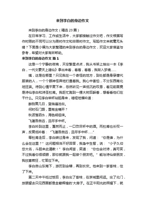与李白相遇作文3篇与李白相遇作文篇1黄昏,海上悬着一轮明日,李白坐在芦苇荡旁的石上,缓缓念道:“日如鸿光,胜似星辰千万光芒。