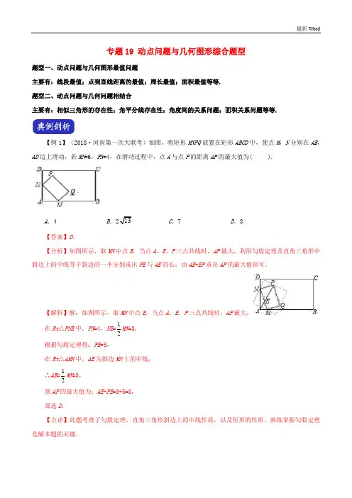 专题19 动点问题与几何图形综合题型题型一、动点问题与几何图形最值问题主要有:线段最值;点到直线距离的最值;周长最值;面积最值等等.题型二、动点问题与几何问题相结合主要有:相似三角形的存在性;角平分线存在性;角度间的关系问题;面积关系问题等等.【例1】(2018·河南第一次大联考)如图,将矩形MNPQ放置在矩形ABCD中,使点M,N分别在AB,AD边上滑动,若MN=6,PN=4,在滑动过程中,点A与点P的距离AP的最大值为( ).A.4 B.C.7 D.8【答案】D.【分析】如图所示,取MN中点E,当点A、E、P三点共线时,AP最大,利用勾股定理及直角三角形中斜边上的中线等于斜边的一半分别求出PE与AE的长,由AE+EP求出AP的最大值即可.【解析】解:如图所示,取MN中点E,当点A、E、P三点共线时,AP最大,在Rt△PNE中,PN=4,NE=12MN=3,根据勾股定理得:PE=5,在Rt△AMN中,AE为斜边MN上的中线,∴AE=12MN=3,则AP的最大值为:AE+PE=3+5=8,故选D.【点评】此题考查了勾股定理,直角三角形斜边上的中线性质,以及矩形的性质,熟练掌握勾股定理是解本题的关键.【变式1-1】(2019·济源一模)如图,△ABC 是等边三角形,AB =3,E 在 AC 上且 AE =23AC ,D 是直线 BC 上一动点,线段 ED 绕点 E 逆时针旋转 90°,得到线段 EF ,当点 D 运动时, 则线段 AF 的最小值是 .【答案】22. 【解析】解:先确定F 点的轨迹,过E 作的直线BC 的平行线,分别过D 、F 作该平行线的垂线,垂足为G ,H , 如图所示,由折叠性质,知△DEG ≌△EFH , ∴EH =DG ,∵△ABC 是等边三角形,AE =2,CE =1, ∴DG =CE ·sin60°=2, 即EH 为定值,∴点F 落在直线FH 上,且FH ⊥BC ,根据垂线段最短,当AF ⊥FH 时,AF 的值最小, 如下图所示,过A 作AN ⊥FH ,延长AC 交FH 于点M ,BAN 的长即为所求线段AF 的最小值,∵EH =DG,∠AMN =30°, ∴EM =2EH∴AM,∴AN =12AM,【例2】(2019·开封二模)如图1,在平面直角坐标系中,直线y =43x ﹣4与抛物线y =43x 2+bx +c 交于坐标轴上两点A 、C ,抛物线与x 轴另一交点为点B ;(1)求抛物线解析式;(2)若动点D 在直线AC 下方的抛物线上,如图2,作DM ⊥直线AC ,垂足为点M ,是否存在点D ,使△CDM 中某个角恰好是∠ACO 的一半?若存在,直接写出点D 的横坐标;若不存在,说明理由.图1 图2【答案】见解析. 【解析】解:(1)在y =43x ﹣4中, 当x =0, y =﹣4,即C (0,﹣4); 当y =0, x =3,即A (3,0);BNM把点A、C坐标代入y=43x2+bx+c,并解得:b=83-,c=-4,∴抛物线解析式为:y=43x283-x-4;(2)存在,作∠ACO的平分线CP交x轴于点P,过P作PH⊥AC于点H,则CH=CO=4,OP=PH,设OP=PH=x,则PA=3﹣x,∵OC=4,OA=3,∴AC=5,AH=1,在Rt△PHA中,PH2+AH2=AP2,即x2+12=(3﹣x)2,解得:x=43,∴tan∠PCH=tan∠PCO=13,①过点D作DG⊥x轴于点G,过点M作ME∥x轴,与y轴交于点E,与DG交于点F.设M(m,43m﹣4),则ME=m,FG=OE=4﹣43m,CE=43m,可得:△CEM∽△MFD,①当∠DCM=12∠ACO时,可得:3CE ME CMMF DF DM ===, 即MF =49m ,DF =13m ,∴DG =DF +GF =13m +4﹣43m =4-m ,EF =EM +FM =139m ,即点D (139m , m -4),将其坐标代入y =43x 283-x -4得:2413813443939m m m ⎛⎫⨯-⨯-=- ⎪⎝⎭, 解得:m =0(舍)或m =1179676, ∴D 点横坐标为:139m =13152.②当∠MDC =12∠ACO =∠PCH 时,同理可得:MF =4m ,DF =3m ,∴EF =EM +MF =m +4m =5m ,DG =DF +FG =3m ﹣43m +4=53m +4,∴D (5m ,﹣53m ﹣4),∴﹣53m ﹣4=()()24855433m m ⨯-⨯-,解得m =0(舍去)或m =720,此时D 点横坐标为:5m =74;综上所述,点D 横坐标为13152或74.【变式2-1】(2019·洛阳模拟)如图,已知抛物线y =13x 2+bx +c 经过△ABC 的三个顶点,其中点A (0,1),点B (9,10),AC ∥x 轴,点P 是直线AC 下方抛物线上的动点.(1)求抛物线的解析式;(2)过点P 且与y 轴平行的直线与直线AB 、AC 分别交于点E 、F ,当四边形AECP 的面积最大时,求点P 的坐标和四边形AECP 的最大面积;(3)当点P 为抛物线的顶点时,在直线AC 上是否存在点Q ,使得以C 、P 、Q 为顶点的三角形与△ABC 相似?若存在,求出点Q 的坐标;若不存在,请说明理由.【答案】见解析.【解析】解:(1)将A (0,1),B (9,10)代入y =13x 2+bx +c 得: 127810c b c =⎧⎨++=⎩,解得:12c b =⎧⎨=-⎩ ∴抛物线的解析式为:y =13x 2-2x +1. (2)由y =13x 2-2x +1知,抛物线的对称轴是x =3, ∵AC ∥x 轴,A (0,1),∴A 与C 关于对称轴对称,C (6,0),AC =6由A (0,1),B (9,10)得直线AB 的解析式为:y =x +1, 设P (m ,13m 2-2m +1),则E (m ,m +1), ∴PE =-13m 2+3m , ∴S 四边形AECP =S △AEC +S △APC=12·AC ·EF +12·AC ·PF =12×6×(-13m 2+3m )l=298124m ⎛⎫--+ ⎪⎝⎭,∴当m =92时,四边形AECP 的面积取最大值814,此时点P (92,54-). (3)存在,点Q 坐标为(4,1)或(-3,1). 由y =13x 2-2x +1知点P (3, -2), ∴PF =3,CF =3,∴∠PCF =45°,同理,∠EAF =45°, 即∠PCF =∠EAF ,由勾股定理得:AB =AC =6,PC = 设Q (n ,1), ①当△CPQ ∽△ABC 时,CQ PCAC AB=,即66n -=t =4, 即Q (4,1).②当△CQP ∽△ABC 时,CQ PCAB AC=,=,解得:t =-3,即Q (-3,1).综上所述,符合题意的点Q 坐标为:(4,1)或(-3,1).1.(2019·济源一模)如图1,在平面直角坐标系中,直线3944y x =-+与x 轴交于点A ,与y 轴交于点B ;抛物线294y ax bx =++(a ≠0)过A ,B 两点,与x 轴交于另一点C (-1,0),抛物线的顶点为D . (1)求抛物线的解析式;(2)在直线AB 上方的抛物线上有一动点E ,求出点E 到直线AB 的距离的最大值;(3)如图2,直线AB 与抛物线的对称轴相交于点F ,点P 在坐标轴上,且点P 到直线 BD ,DF 的距离相等,请直接写出点P 的坐标.图1 图2【答案】见解析.【解析】解:(1)在3944y x =-+中,当x =0时,y =94;当y =0时,x =3,即A (3,0),B (0,94), 将A (3,0),C (-1,0)代入294y ax bx =++得: 99304904a b a b ⎧++=⎪⎪⎨⎪-+=⎪⎩,解得:3432a b ⎧=-⎪⎪⎨⎪=⎪⎩,∴抛物线的解析式为:2339424y x x =-++.(2)过点E 作EM ⊥x 轴交AB 于M ,过E 作EN ⊥AB 于N ,点E 到AB 的距离为EN , 可得△ENM ∽△AOB , ∴EN 