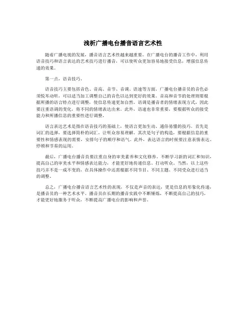 一、语音表达良好的语音是广播电台播音语言艺术性的基础,播音员需要具备清晰、准确、生动的语音表达能力。