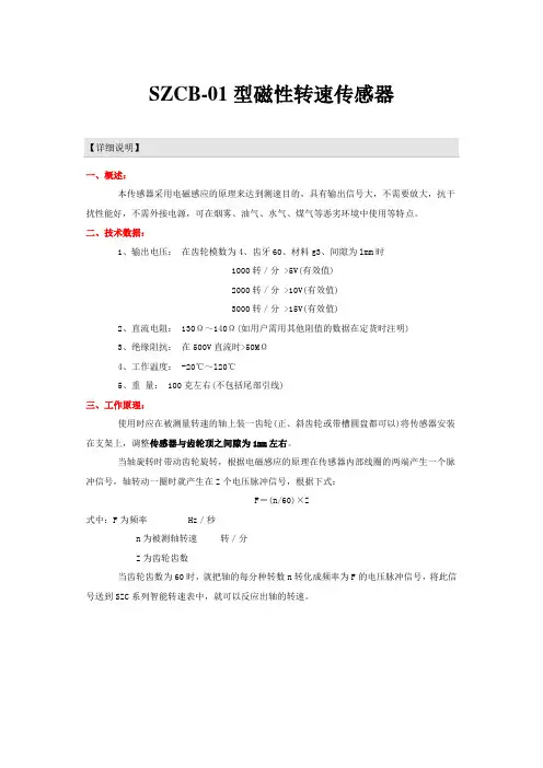 SZCB-01型磁性转速传感器一、概述:本传感器采用电磁感应的原理来达到测速目的,具有输出信号大,不需要放大,抗干扰性能好,不需外接电源,可在烟雾、油气、水气、煤气等恶劣环境中使用等特点。