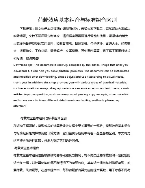 文档下载后可定制修改,请根据实际需要进行调整和使用,谢谢!本店铺为大家提供各种类型的实用资料,如教育随笔、日记赏析、句子摘抄、古诗大全、经典美文、话题作文、工作总结、词语解析、文案摘录、其他资料等等,想了解不同资料格式和写法,敬请关注!Download tips: This document is carefully compiled by this editor. I hope that after you download it, it can help you solve practical problems. The document can be customized and modified after downloading, please adjust and use it according to actual needs, thank you! In addition, this shop provides you with various types of practical materials, such as educational essays, diary appreciation, sentence excerpts, ancient poems, classic articles, topic composition, work summary, word parsing, copy excerpts, other materials and so on, want to know different data formats and writing methods, please pay attention!荷载效应基本组合与标准组合区别在结构工程领域,荷载效应的计算是设计过程中至关重要的一部分。