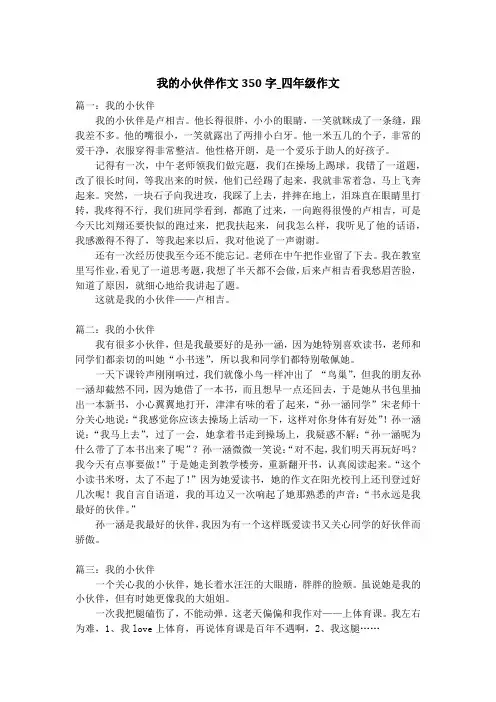 以下是小编整理的我的小伙伴350字学生作文,欢迎阅读!我的小伙伴350字学生作文1在我童年时代,有很多很多的小伙伴,跟我时间最长、最要好的就是闫纬一了。