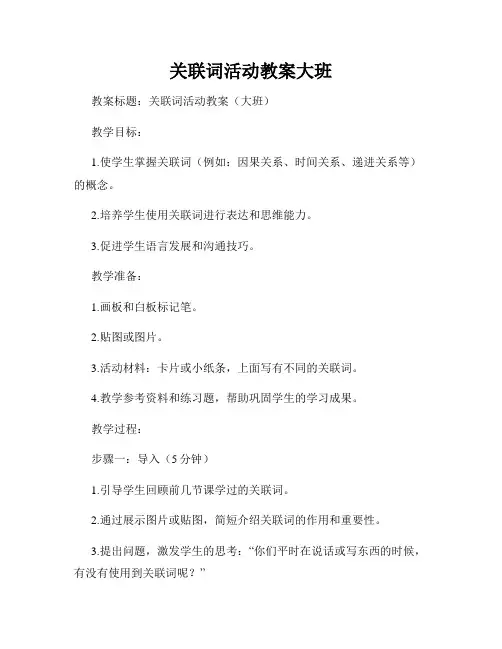 关联词活动教案大班教案标题:关联词活动教案(大班)教学目标:1.使学生掌握关联词(例如:因果关系、时间关系、递进关系等)的概念。